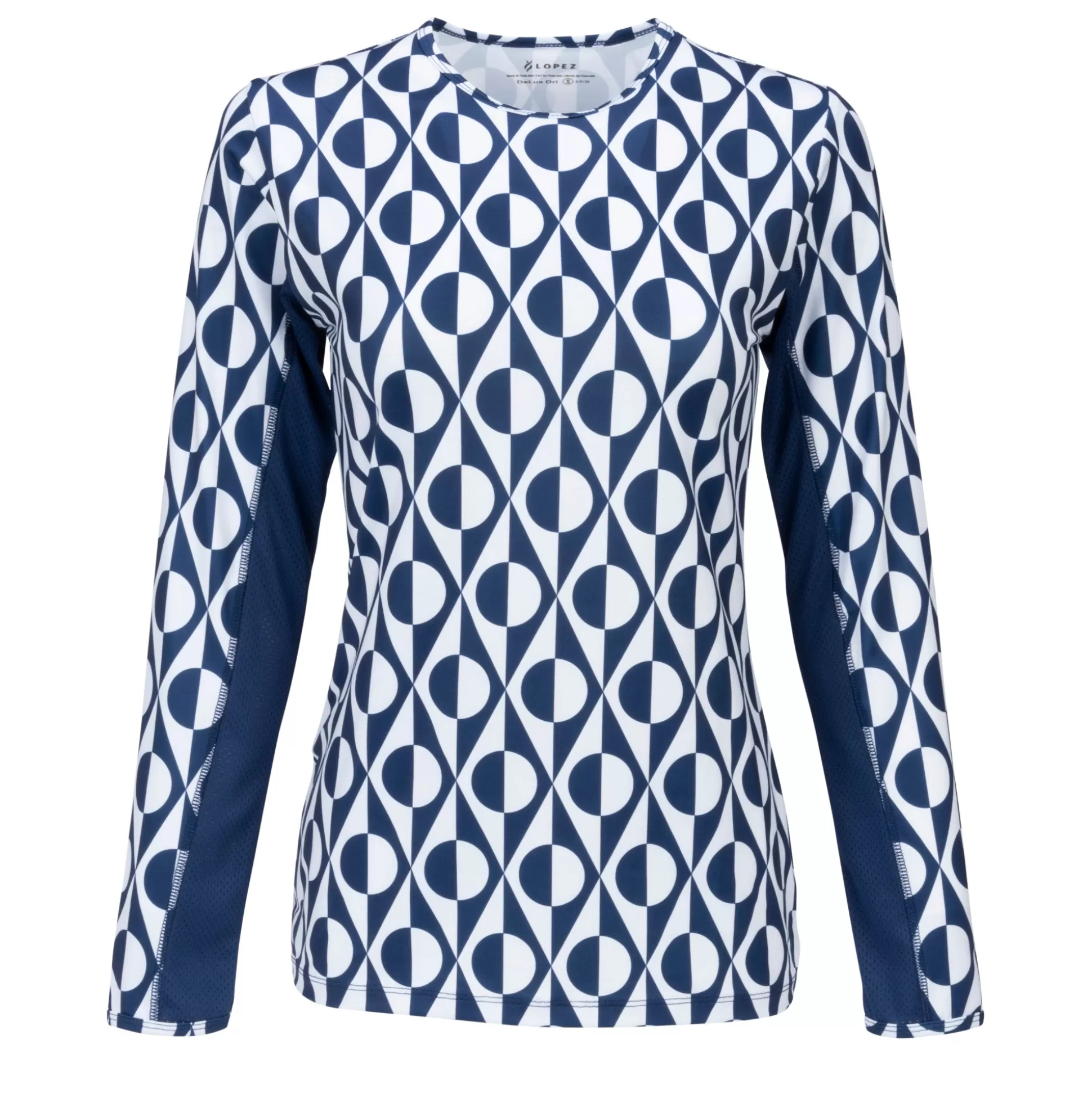 The Women’s Aspiration Long Sleeve Tee Is Constructed From A Beautifully Printed Jersey That Is Soft On The Skin Yet Cool To The Touch. This Long-Sleeve Tee Is Made Using A 90% Polyester/10% Spandex Blend For The Most Comfortable, Versatile Piece Of Sportswear. The Crew Neckline And Mesh Insets Under The Sleeve For Maximum Breathability Present An Attractive, Sleek Look For The Female Golfer. Using Delux Dri™ Moisture Wicking Technology, The Lightweight Jersey Fabric Will Keep You Cool And Dry From The First Tee To The Final Green. Stay Shielded From The Sun With Its Upf 50+ Protection. With The Signature Lopez Flame Icon At The Right Hip, This Tee Boldly Highlights The Golfer As She Conquers The Eighteen Holes.