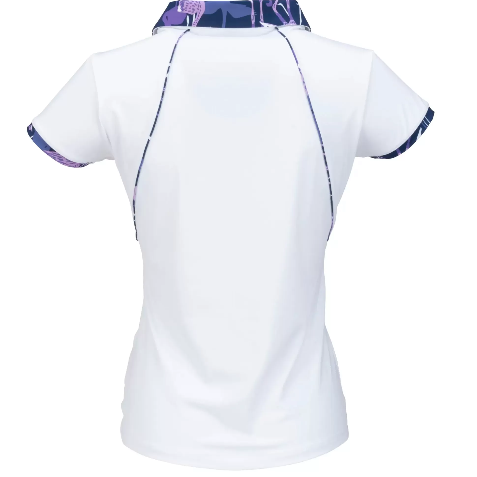 The Folly Short Sleeve Polo Is Constructed From A Beautiful Printed And Solid Jersey That Is Soft On The Skin Yet Cool To The Touch. This Polo Is Made Using A 90% Polyester/10% Spandex Blend For The Most Comfortable, Versatile Piece Of Sportswear. The Contrast Printed Collar, Sleeve Cuffs, Piping Details, And Zip Placket With Metallic Jewel Zipper Pull Presents An Attractive, Sleek Look For The Female Golfer. Using Delux Dri™ Moisture Wicking Technology, The Lightweight, Jersey Fabric Will Keep You Cool And Dry From The First Tee To The Final Green. With The Signature Lopez Flame Icon At The Right Hip, This Polo Boldly Highlights The Golfer As She Conquers The Eighteen Holes. This Polo Is Perfect For Pairing With Any Single-Colored Or Printed Golf Bottom.