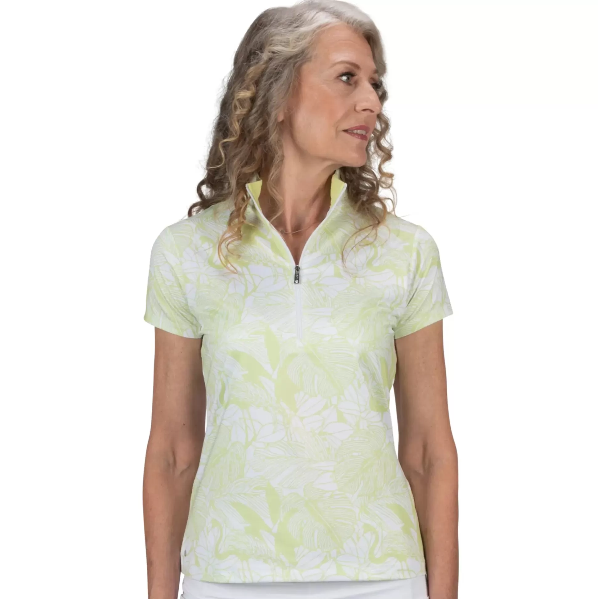 The Lush Short Sleeve Polo Is Constructed From A Beautiful Printed Jersey That Is Soft On The Skin Yet Cool To The Touch. This Polo Is Made Using A 90% Polyester/10% Spandex Blend For The Most Comfortable, Versatile Piece Of Sportswear. The Mock Collar And Zip Placket With Metallic Jewel Zipper Pull Presents An Attractive, Sleek Look For The Female Golfer. Using Delux Dri™ Moisture Wicking Technology, The Lightweight, Jersey Fabric Will Keep You Cool And Dry From The First Tee To The Final Green. With The Signature Lopez Flame Icon At The Right Hip, This Polo Boldly Highlights The Golfer As She Conquers The Eighteen Holes. This Polo Is Perfect For Pairing With Any Single-Colored Golf Bottom.