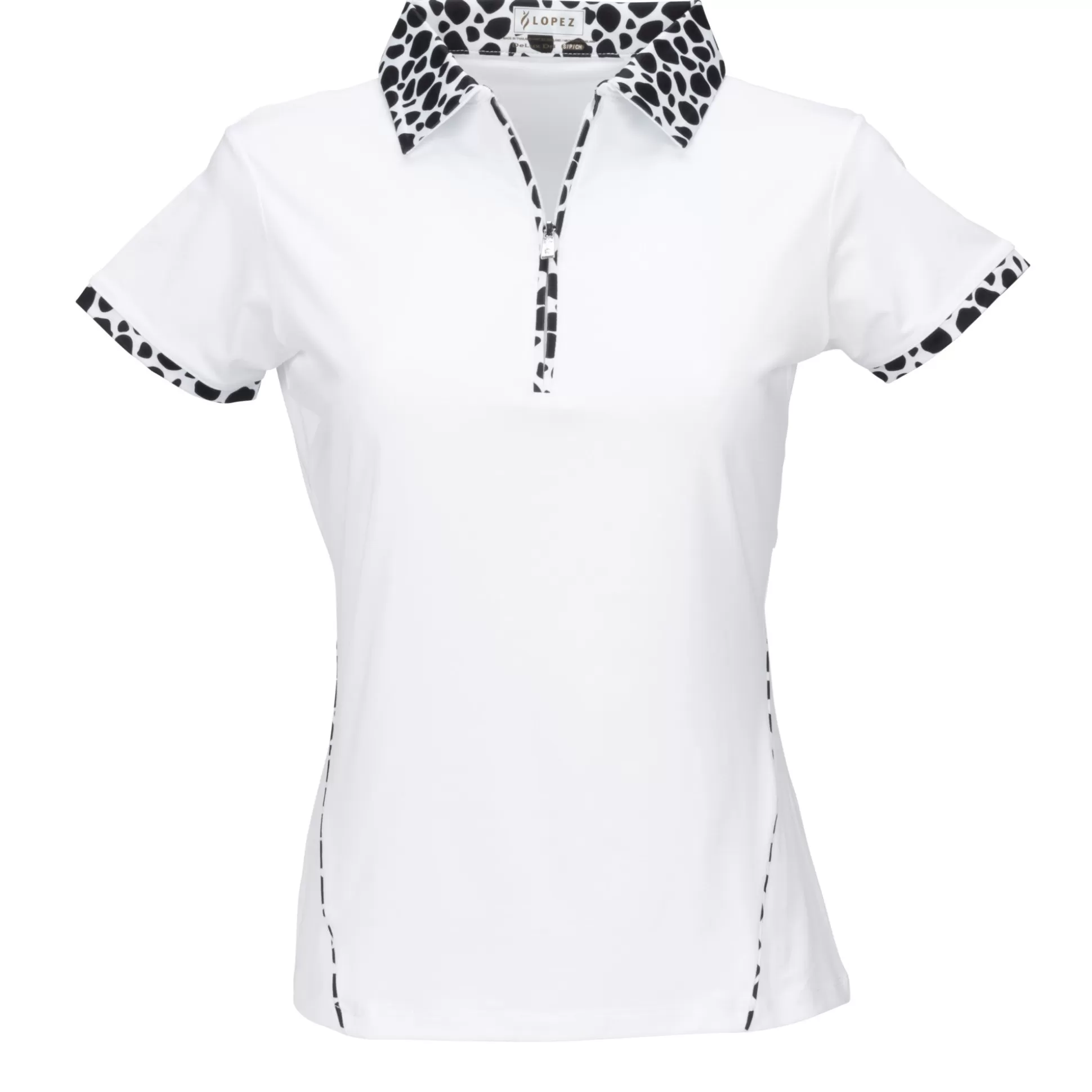 The Splendor Short Sleeve Polo Is Constructed From A Beautiful Printed And Solid Jersey Made From A 90% Polyester/10% Spandex Blend That Is Soft On The Skin, Yet Cool To The Touch. The Contrast Printed Collar, Sleeve Cuffs, Piping Details And Zip Placket With Metallic Jewel Zipper Pull Offer An Attractive, Sleek Neckline For The Female Golfer. Using Delux Dri™ Moisture Wicking Technology, The Lightweight Jersey Fabric Will Keep You Cool And Dry From The First Tee To The Final Green. With The Signature Lopez Flame At The Right Hip, This Polo Is The Perfect Choice To Pair With Any Single-Colored Or Printed Golf Bottom.
