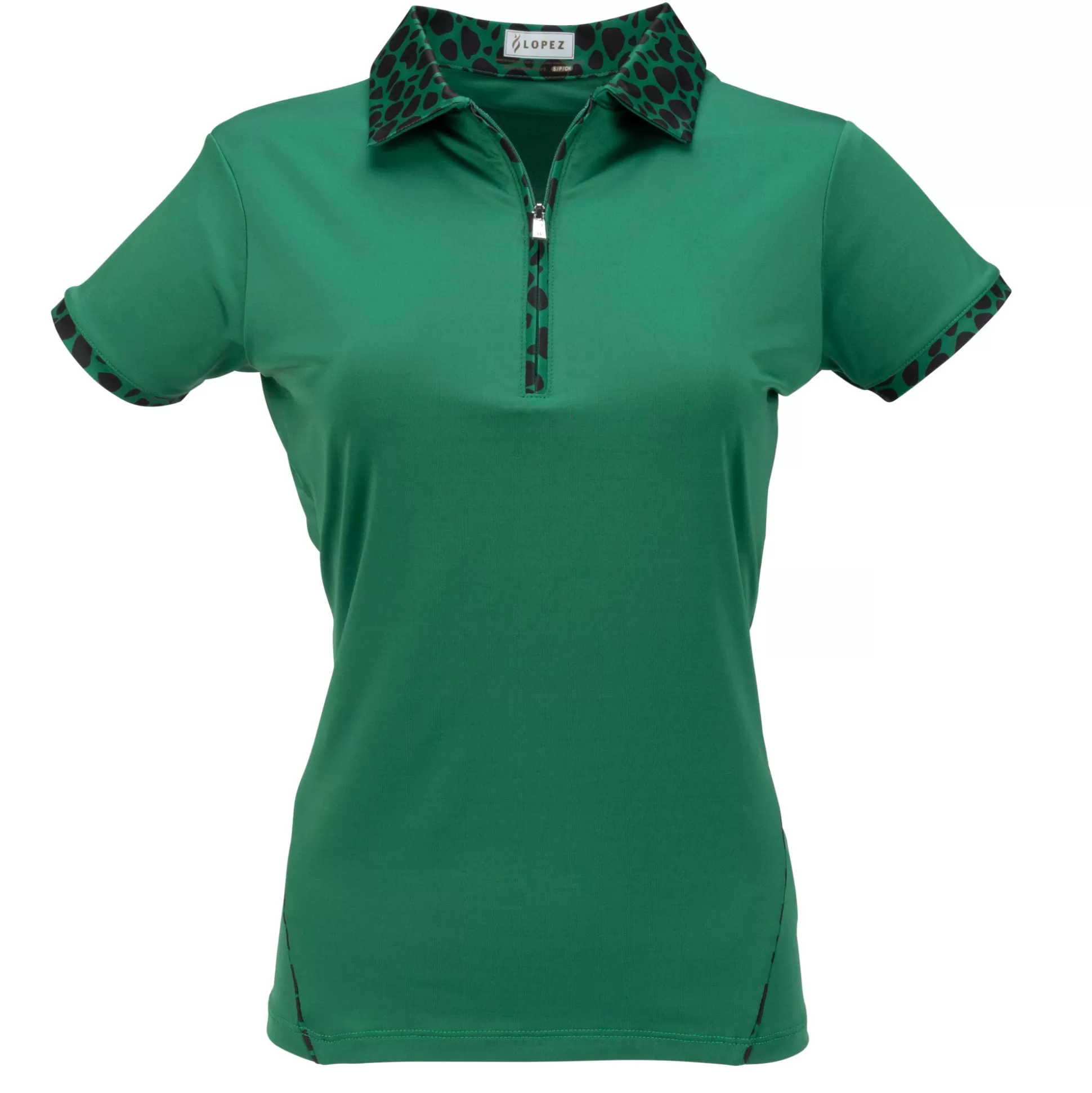 The Splendor Short Sleeve Polo Is Constructed From A Beautiful Printed And Solid Jersey Made From A 90% Polyester/10% Spandex Blend That Is Soft On The Skin, Yet Cool To The Touch. The Contrast Printed Collar, Sleeve Cuffs, Piping Details And Zip Placket With Metallic Jewel Zipper Pull Offer An Attractive, Sleek Neckline For The Female Golfer. Using Delux Dri™ Moisture Wicking Technology, The Lightweight Jersey Fabric Will Keep You Cool And Dry From The First Tee To The Final Green. With The Signature Lopez Flame At The Right Hip, This Polo Is The Perfect Choice To Pair With Any Single-Colored Or Printed Golf Bottom.